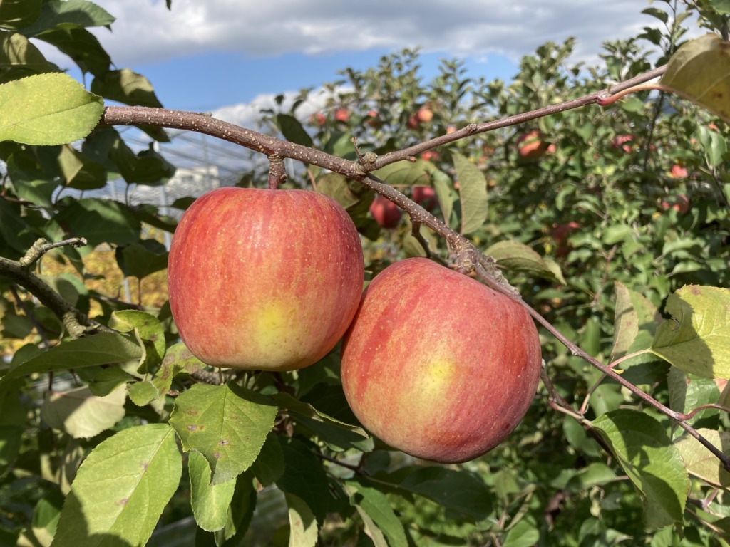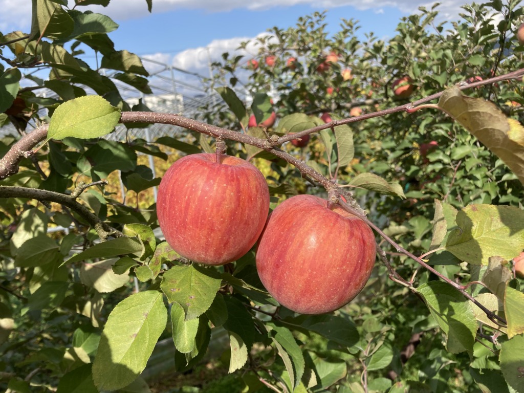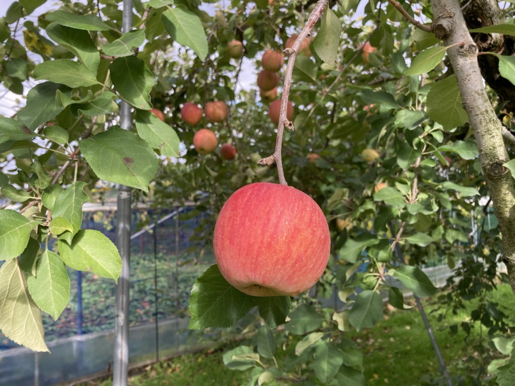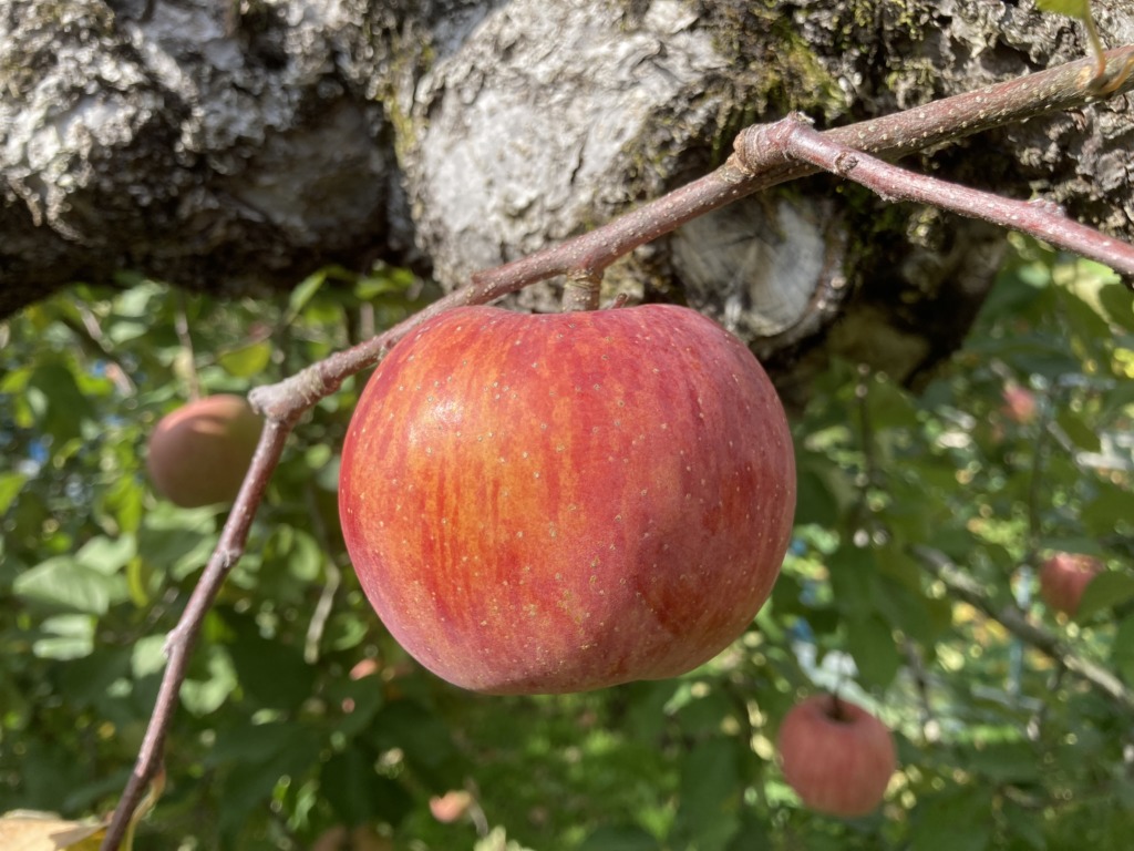 りんごはこのほかにも剪定、花摘み、摘果、葉摘み、消毒等の作業を行っています。こうした作業を経て、赤くて美味しいりんごに育つのです!